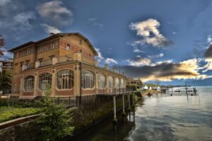 LA LOCATION: Palazzo Verbania, risalente ai primi anni del Novecento è stato realizzato per dotare Luino di un luogo destinato a feste, riunioni, conferenze ma anche di caffè e ristorante. Dotato di un panorama di rara bellezza, costituisce un dialogo con il paesaggio, con la creazione di una “cascata” di terrazze verso lo specchio d’acqua. Al piano terra sono stati mantenuti gli spazi espositivi e la sala conferenze, mentre il primo piano è adibito a caffè/ristorante. L’intero complesso è stato riportato agli antichi splendori d’un tempo, ripristinando le sue decorazioni originali ma conservando l’originario padiglione liberty.